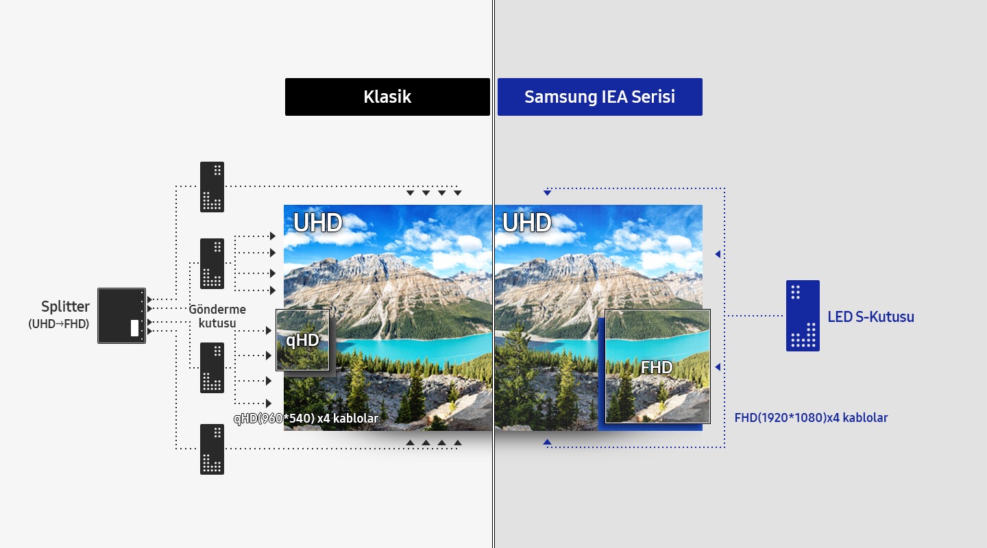 Samsung uyumlu S-Box, yüksek performans gerektiren içeriklerin tek, merkezi bir cihazda sunulmasını sağlar. S-Box, harici kutulara veya dağıtıcılara ihtiyaç duyulmadan UHD içeriği birden fazla IEA Serisi ekrana ileterek işletmelerin daha hızlı ve daha düşük maliyetli operasyonların keyfini çıkarmasını sağlar.