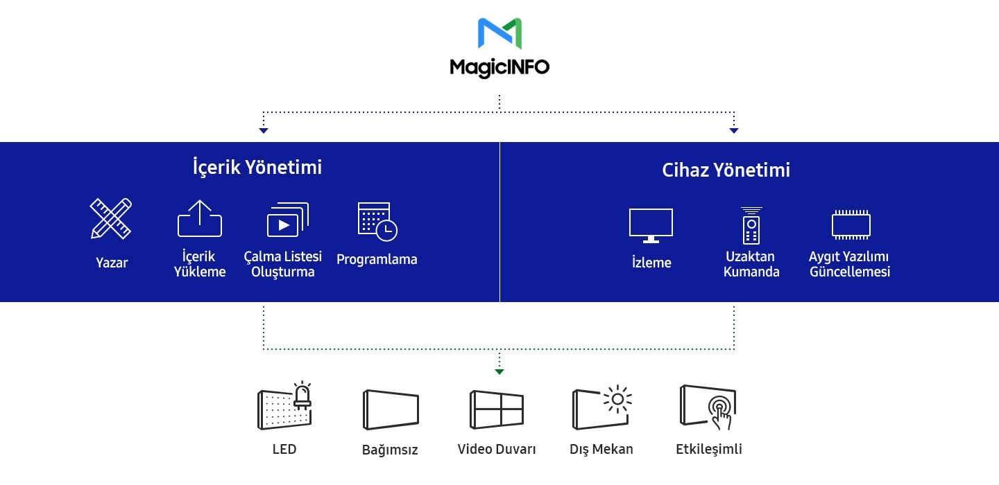 IEA Serisi kullanıcıları, MagicINFO platformu uyumluluğu sayesinde tüm panel ağı boyunca içerik oluşturabilir, planlayabilir ve kullanabilir. Kullanıcılar da benzer şekilde uzaktan erişim yoluyla herhangi bir yerden ekranı izleyebilir ve ekran ayarlarını yapabilir ve potansiyel performans sorunlarını giderebilir.
