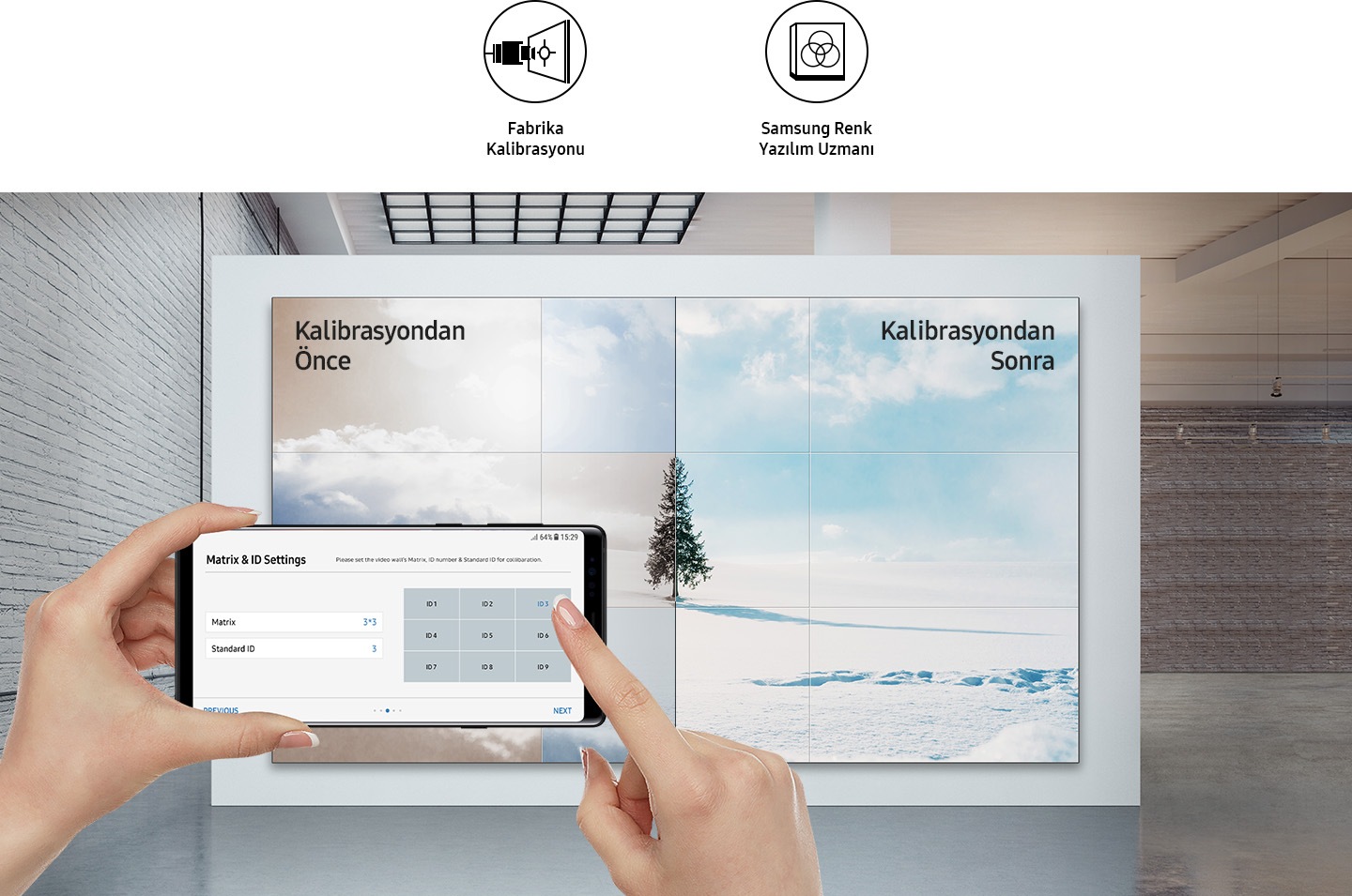 Çok adımlı fabrika ayarı sayesinde tek tip parlaklık ve renk elde edilir. Kullanıcı aynı zamanda gelişmiş ayarlardaki ücretsiz güçlü Color Expert Pro yazılımı yardımıyla ince ayar yapabilir. Color Expert Pro Mobil uygulaması, hızlı ve basit kalibrasyon için bir cep telefonu kamerası kullanarak en fazla 5x5 boyutlarındaki ekranların beyaz dengesi ayarlarının yapılmasına imkan verir.